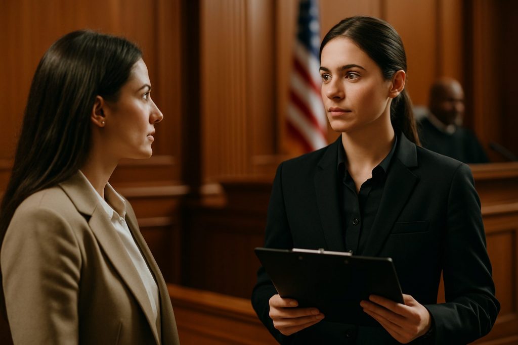 Female private investigator testifying in a courtroom, seated at a witness stand with a microphone and courtroom background.